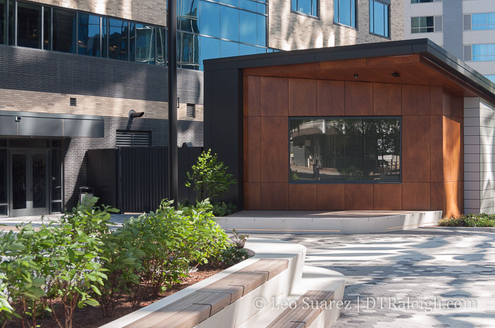 The plaza between the two office buildings is now the Gold Standard for public spaces in Raleigh. There’s room to stroll and various nooks to sit at with a variety of views towards the small stage. Two kiosks are inside the plaza which I hope have some new local businesses. I can imagine small scale performances, popup markets, and art shows taking place here. Even late night parties and corporate events could use the space as it looks wired up with speakers and a large screen.