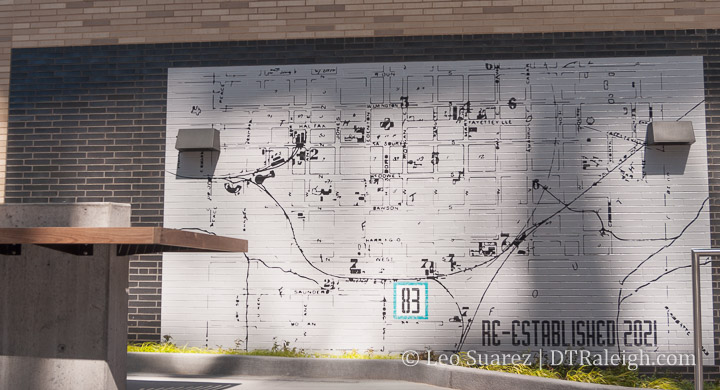 The name actually has a nod to the block numbers on the old insurance maps of downtown Raleigh. I guess at the time, it was just “Raleigh” as Block 83 was near the edge of the city limits back then. You can see all the downtown blocks numbered here from 1896 or see it in person thanks to this slick mural along the plaza showing a portion of the map.